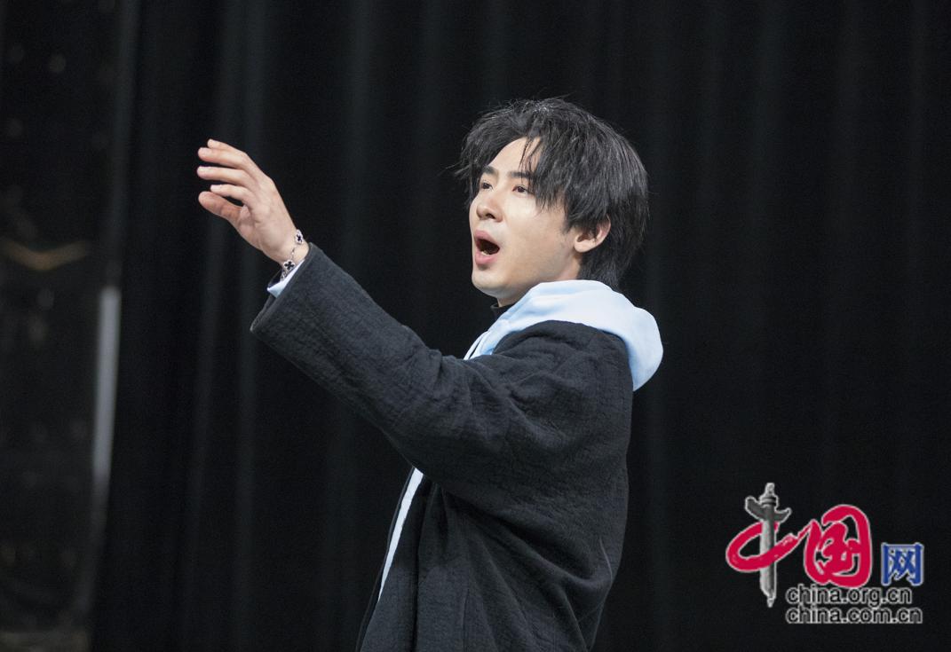 青年演员湛嘉丽在剧中一人分饰两角,其清亮婉转的嗓音与细腻精准的肢体表达,生动诠释了不同时代女性共有的坚韧与偶尔的迷茫。剧中关键的“时空连接者”——“晶石”角色,由高天鹤、赵越两位实力派男高音共同诠释,成为演出的一大亮点。探班现场,高天鹤以空灵悠远、宛如海豚音的假声男高音即兴哼唱,虽无复杂的花腔技巧,却自带神秘气息,完美呼应了“大鹏鸟眼泪化为晶石”的古老传说;赵越则以高亢而富有穿透力的唱腔,展现了角色作为时代见证者的厚重与力量。