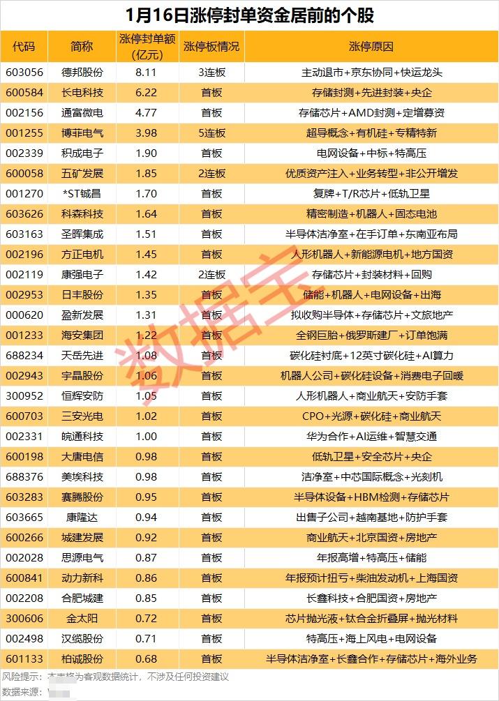 封死涨停的个股中,*ST阳光(维权)、*ST荣控等9股为ST股。以封单金额计算,德邦股份、长电科技、通富微电等涨停板封单资金居前,分别有8.11亿元、6.22亿元、4.77亿元。