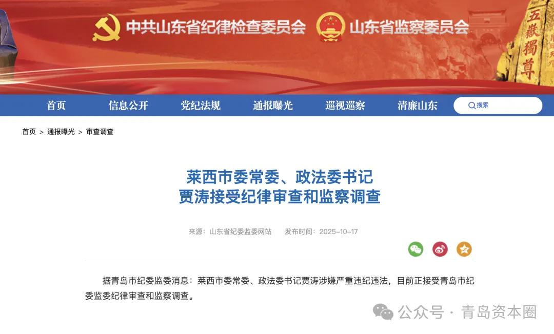 10月17日,山东省纪委监委发布消息,莱西市委常委、政法委书记贾涛涉嫌严重违纪违法,目前正接受青岛市纪委监委纪律审查和监察调查。