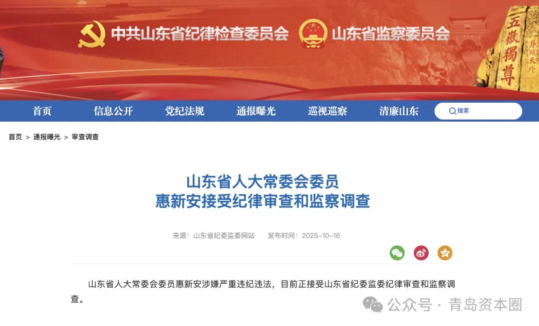 10月16日,山东省纪委监委发布消息称,山东省人大常委会委员惠新安涉嫌严重违纪违法,目前正接受山东省纪委监委纪律审查和监察调查。