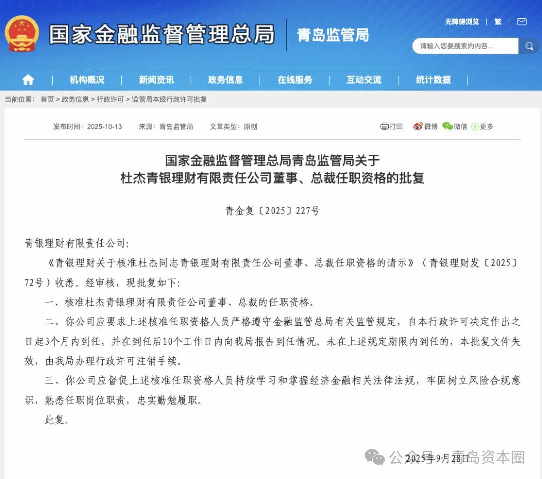 10月13日,国家金融监督管理总局青岛监管局发布批复,正式核准杜杰青银理财有限责任公司董事、总裁的任职资格。这一消息意味着,自 2023 年 11 月原总裁王茜升任董事长后便长期悬缺的青银理财总裁职位,在历经近 2 年的代理履职与人事调整后,终于迎来正式接任者,公司核心管理架构也随之进一步补位完善。