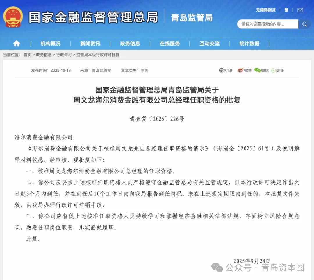 10 月 13 日,国家金融监督管理总局青岛监管局发布两则重要任职批复公告,正式核准周文龙担任海尔消费金融有限公司总经理的任职资格,以及俞文佳担任该公司副总经理的任职资格。这两项人事任命的落地,为长期处于管理层空缺状态的海尔消金注入新活力,也引发行业对这家 “产业系” 消费金融公司未来发展方向的高度关注。