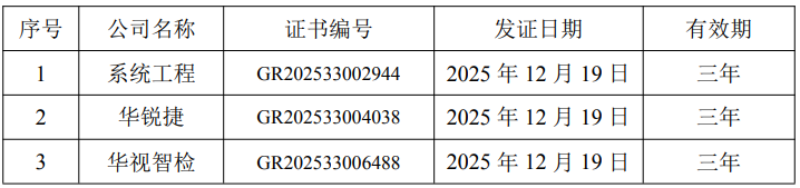 此次认定是华锐捷、系统工程、华视智检原高新技术企业证书有效期满后的重新认定。根据相关规定,系统工程、华锐捷、华视智检在接下来的三年内将享受国家关于高新技术企业的相关优惠政策,企业所得税将按15%的税率缴纳。