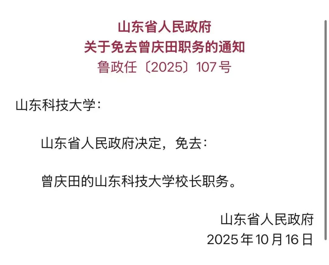 《青岛资本圈》了解到,山东科技大学原校长曾庆田已任农银金融科技有限责任公司(简称 “农银金科”)总裁。此前10月16日,山东省人民政府发布公告,曾庆田已被免去山东科技大学校长职务。