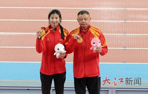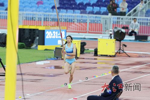 11月18日晚,江西运动员危菱侠在第十五届全国运动会女子撑竿跳高项目中以4.30米的成绩夺得金牌。