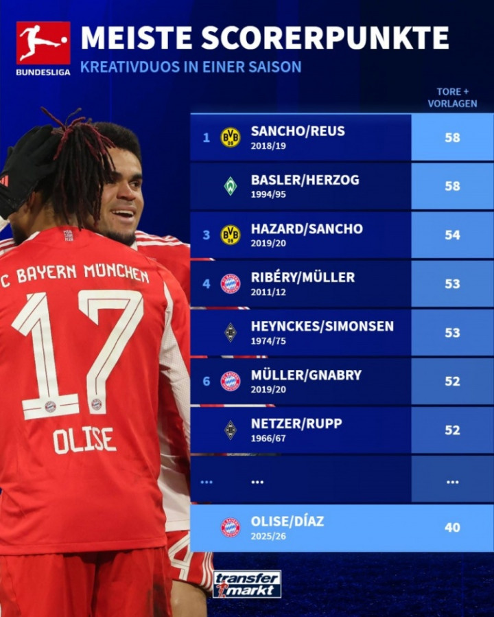 直播吧1月15日讯奥利塞和迪亚斯在本赛季德甲的出色表现也引发了“新罗贝里”的讨论,《转会市场》数据统计显示迪亚斯+奥利塞半程直接参与40球是德甲边锋组合历史最高,距离单赛季纪录也仅差18球。